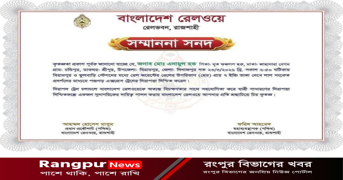 বুদ্ধিমত্তা দিয়ে রেল দুর্ঘটনা থেকে রক্ষায় বিরামপুরের এনামুলকে সংবর্ধনা