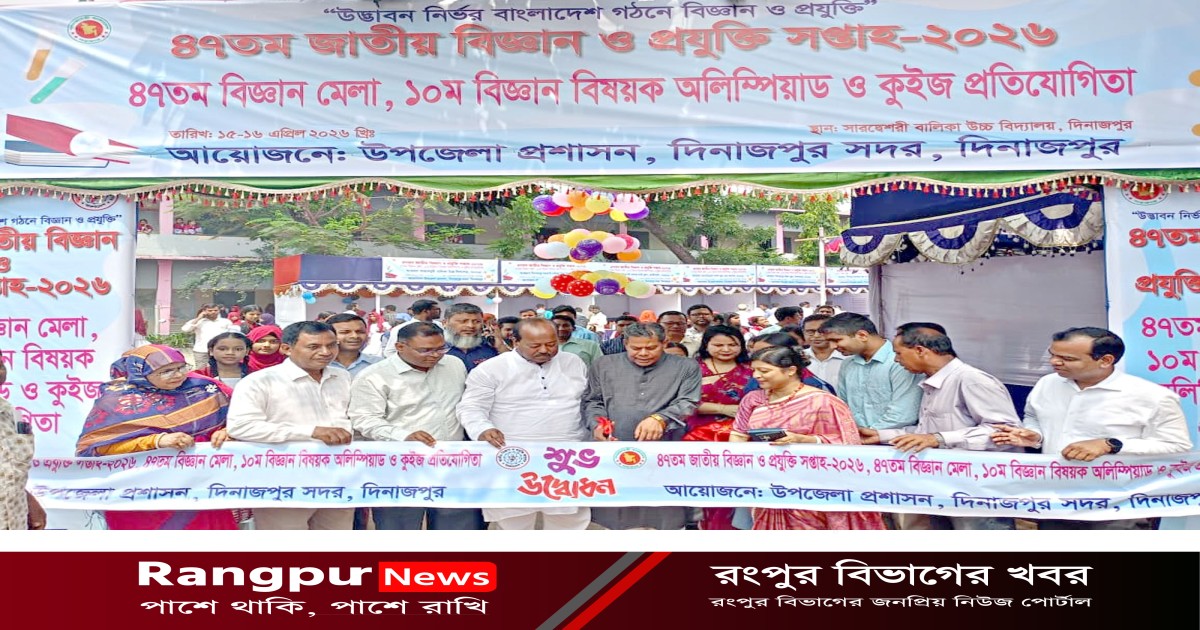 আজ বুধবার ১৫ এপ্রিল-২০২৬ দিনাজপুর সদর উপজেলা প্রশাসনের আয়োজনে ২দিনব্যাপী দিনাজপুর সারদেশ্বরী বালিকা উচ্চ বিদ্যালয় প্রাঙ্গণে ৪৭ তম জাতীয় বিজ্ঞান ও প্রযুক্তি সপ্তাহ- ২০২৬ এর উদ্বোধন করা হয়েছে।