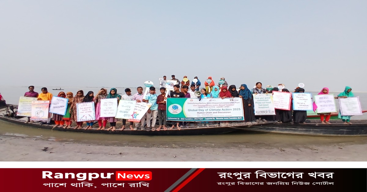 “জলবায়ু পরিবর্তন মোকাবেলায় ন্যায়সঙ্গত রূপান্তর”—এই প্রতিপাদ্যকে সামনে রেখে গাইবান্ধার ফুলছড়ি উপজেলার ফজলুপুর ইউনিয়নের পশ্চিম খাটিয়ামারী চরে জলবায়ু পরিবর্তনের ঝুঁকি মোকাবেলায় এক প্রতিবাদ কর্মসূচি অনুষ্ঠিত হয়েছে। মানুষের জন্য ফাউন্ডেশনের সহযোগিতায়, সুইডেন সরকারের অর্থায়নে এবং এসকেএস ফাউন্ডেশনের বাস্তবায়নাধীন ‘কমিউনিটিভিত্তিক জলবায়ু সহনশীলতা ও নারীর ক্ষমতায়ন কর্মসূচি (ক্রিয়া)’ প্রকল্পের উদ্যোগে শুক্রবার (১৪ নভেম্বর) সকালে স্থানীয় শিক্ষার্থী, তরুণ ও জলবায়ু আন্দোলনকর্মীরা কর্মসূচিতে অংশ নেন।