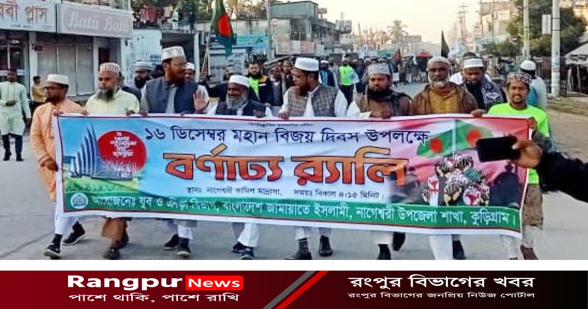 দুর্নীতি মুক্ত হবে এই বিজয় মাসে,এই অঙ্গিকারও করেন তিনি। এসময় বিজয় র্যালিতে আরো উপস্থিত ছিলেন উপজেলা জামায়াতে ইসলামীর আমির আব্দুল মান্নান মিঞা, সেক্রেটারি মাওলানা শহিদুল ইসলাম, পৌর আমির মাওলানা মকবুল হোসেন, শুরা ও কর্মপরিষদ সদস্য আফজাল হোসেন ,শ্রমিক কল্যান ফেডারেশনের নাগেশ্বরী উপজেলার সভাপতি রফিকুল ইসলাম, যুব বিভাগের সভাপতি