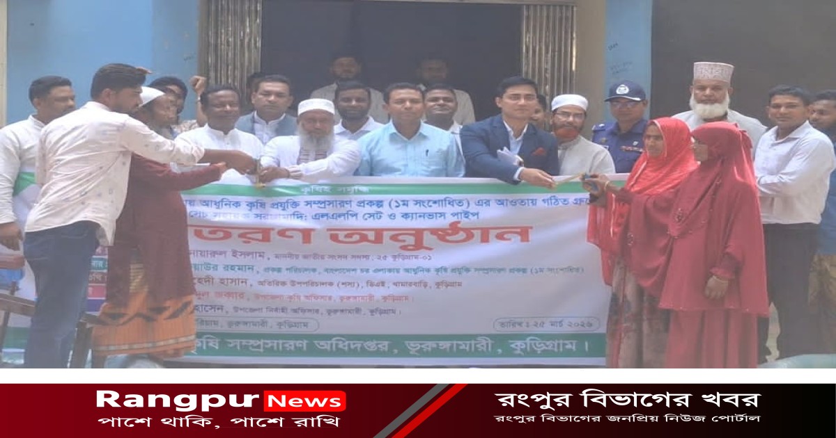 কুড়িগ্রামের ভূরুঙ্গামারীতে চরের অনাবাদি জমিতে উন্নত সেচ ব্যবস্থা নিশ্চিত করে ফসলের উৎপাদন বাড়ানোর লক্ষে কৃষি সম্প্রসারণ অধিদপ্তরের আয়োজনে বাংলাদেশে চর এলাকায় আধুনিক কৃষি প্রযুক্তি সম্প্রসারণ প্রকল্প (১ম সংশোধিত) এর আওতায় গঠিত গ্রুপে সেচ সহায়ক সরঞ্জামাদি এলএলপি সেট ও ক্যানভাস পাইপ বিতরণ করা হয়েছে।