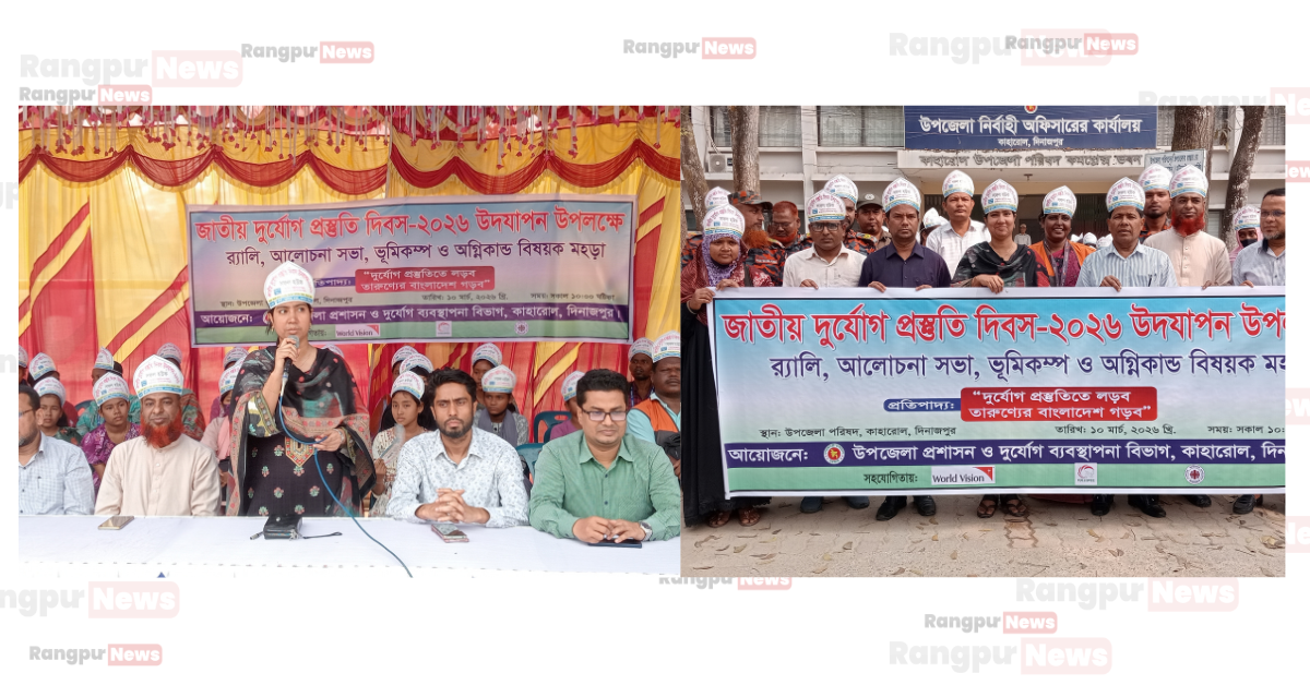 কাহারোলে জাতীয় দুর্যোগ প্রস্তুতি দিবস উপলক্ষে র্যালি ও মহড়া অনুষ্ঠিত
